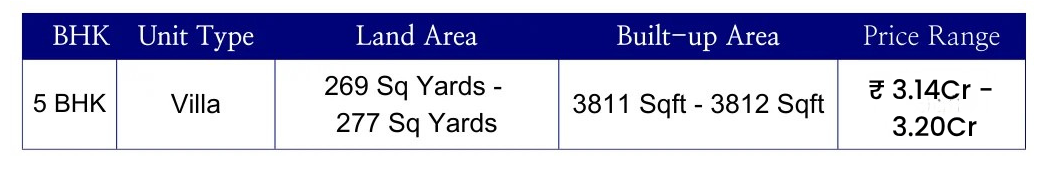 Set in 12 Acres of tranquil, landscaped gardens. This exclusive villa community is home to just 130 privileged families who value privacy, beauty and sophisticated living. Each 5 BHK (G+2) villa blends modern architecture with plenty of natural light and ventilation.